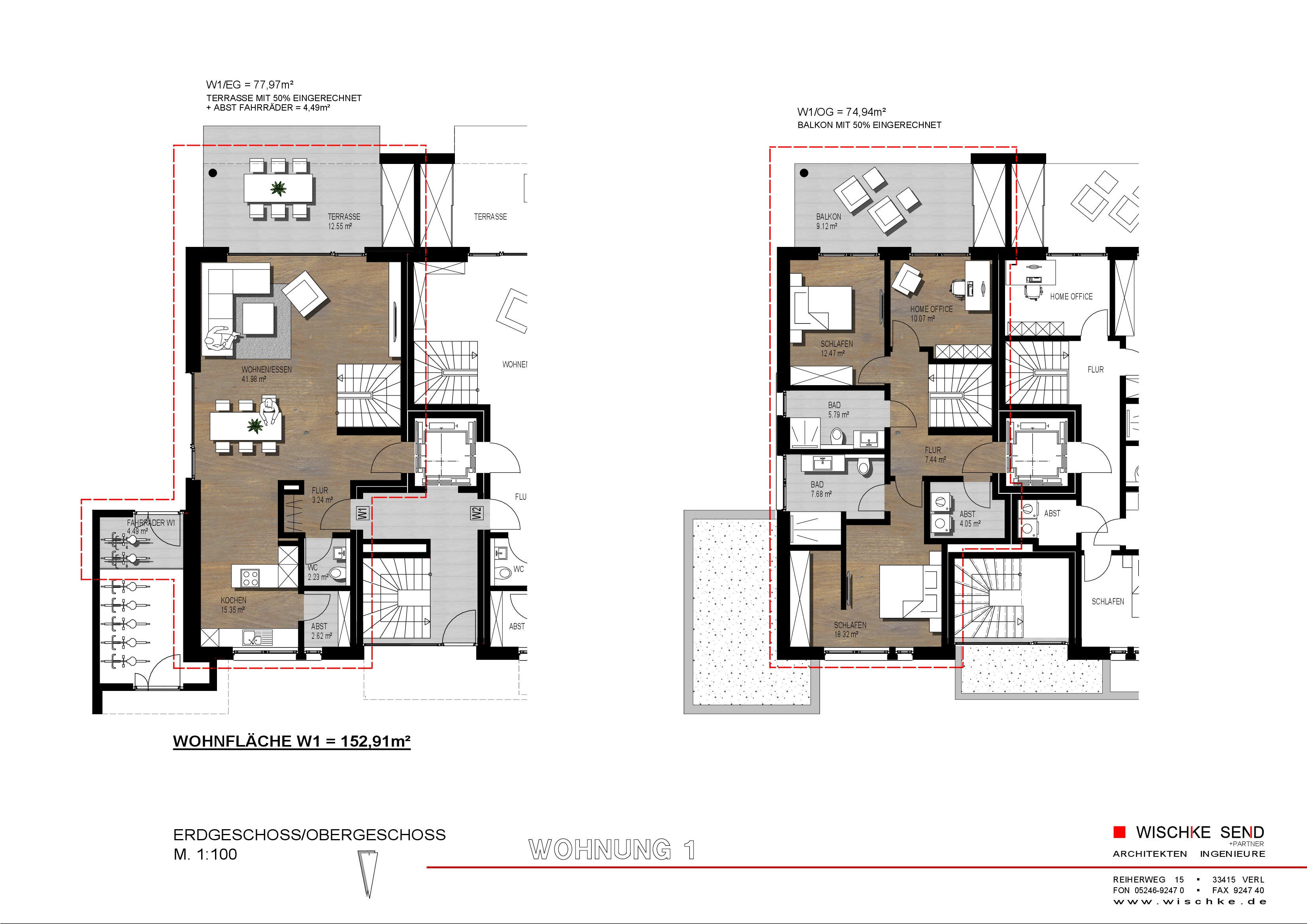 Die beiden Maisonette Wohnungen haben jeweils 4 Zimmer, die sich auf das EG und 1.OG wie folgt verteilen (siehe Grundriss):