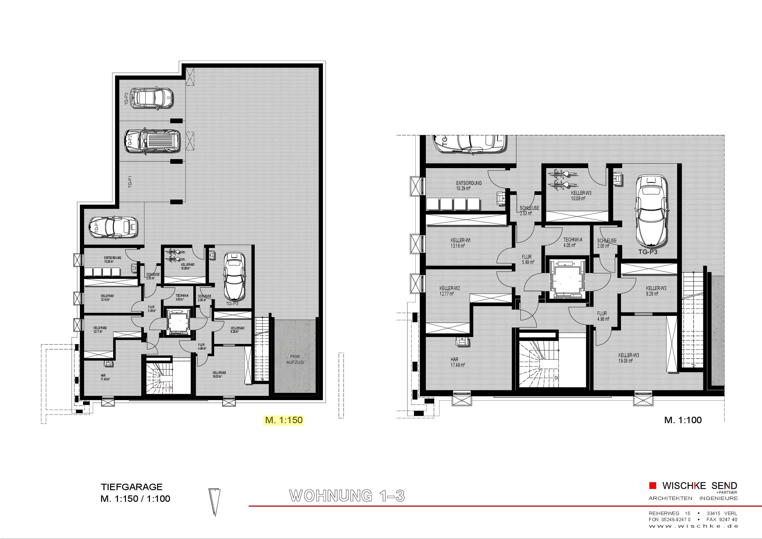 – große Tiefgarage mit viel Rangierfläche und PKW Aufzug (Aufzug/Tor ist von außen nicht sichtbar)